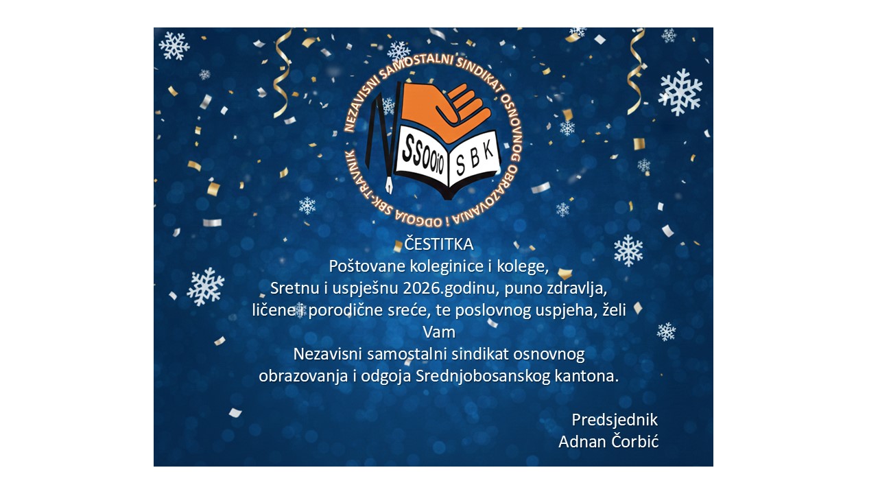 Ovim putem Vas obavjestavam da su Sindikati osnovnog obrazovanja i odgoja Srednjobosanskog kantona, nakon 7 mjeseci pregovaranja u razlicitim formatima, sa Vladom Srednjobosanskog kantona usaglasili tekst Kolektivnog ugovora za osnovne skole u Srednjobosanskom kantonu. Svecano ptpisivanje obavljeno je povodom 5.oktobra-Svjetskog dana nastavnika, 6.10.2025.godine u zgradi Vlade sa Premijerom Vlade Srednjobosanskog kantona Tahirom Lendom. Pregovaracki tim Nezavisnog samostalnog sindikata osnovnog obrazovanja i odgoja Srednjobosanskog kantona izrazava svoje zadovoljstvo usaglasenim i potpisanim tekstom Kolekivnog ugovora.